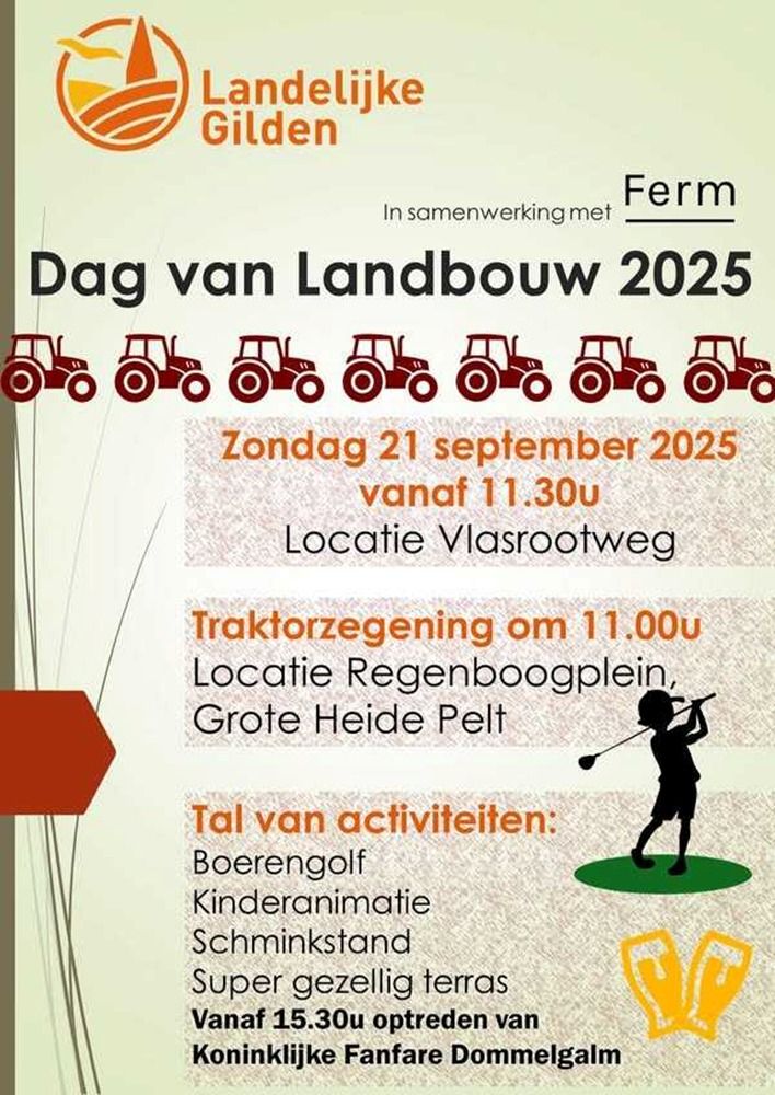 Op zondag 21 september, dag van de landbouw!! Om 11 uur tractorzegening voor grote en kleine tractoren en daarna vanaf 11h30 feest in en om de feesttent. Met allerhande animatie voor de kinderen en boerengolf voor de grote. Vlasrootweg naast nr 58 Om 15h30 optreden van de koninklijke fanfare Dommelgalm, onder het motto ‘Dommelgalm komt naar je toe’.
